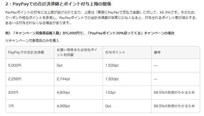 1回のお支払いにおけるPayPayポイントの付与率上限は「PayPayでの決済金額」の66.5%までとなります。