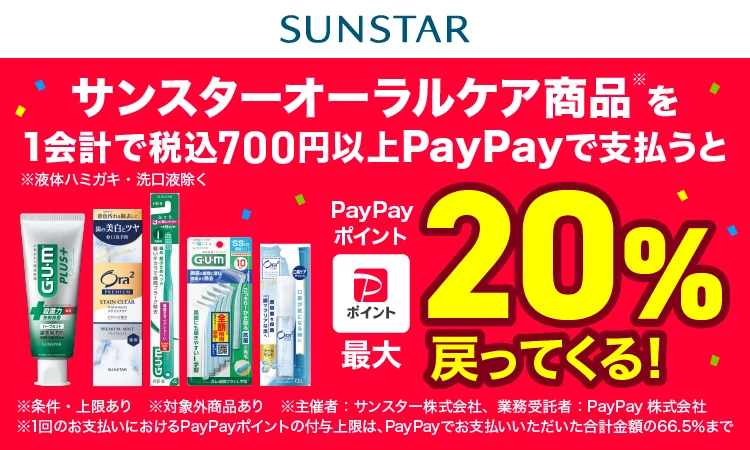 「サンスターオーラルケア商品の購入でPayPayポイントが最大20%戻ってくる!」キャンペーン – キャッシュレス決済のPayPay